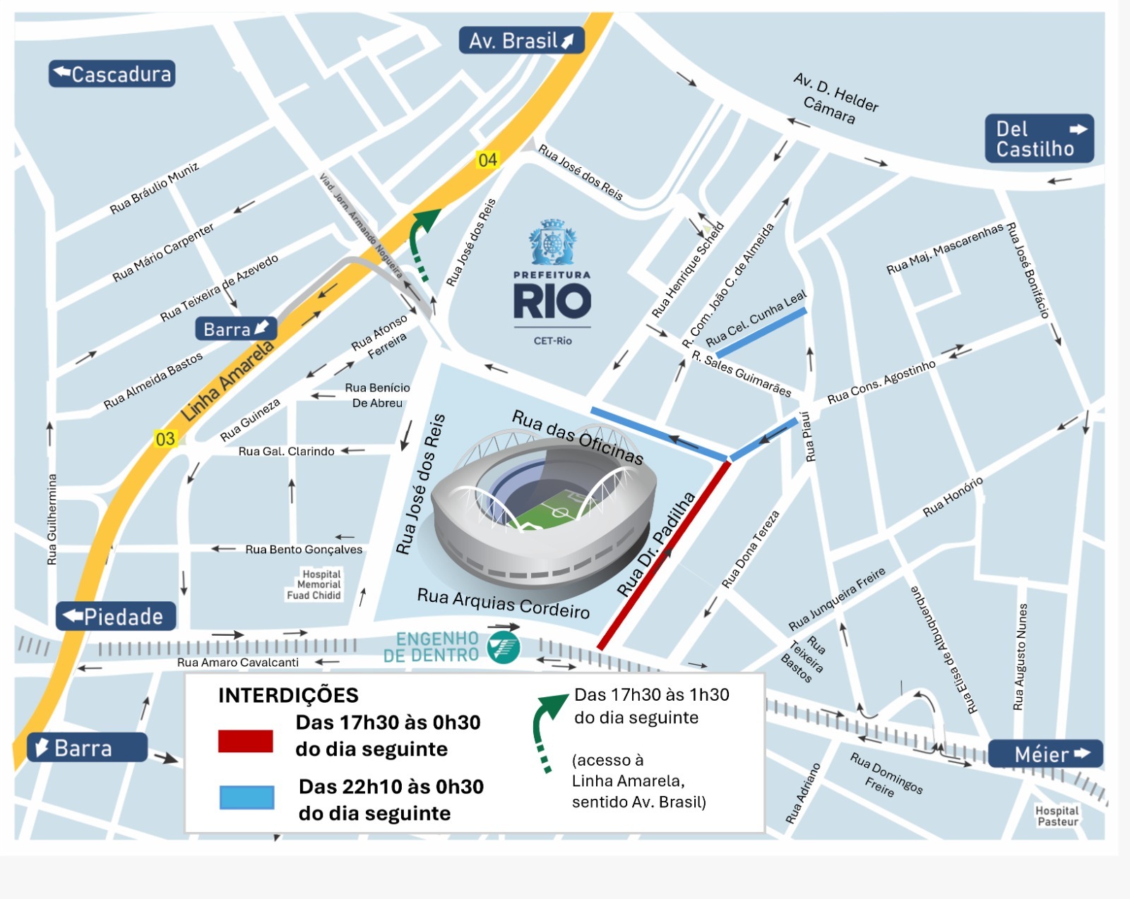 O acesso à Linha Amarela, sentido Avenida Brasil/Fundão, poderá ser realizado pela rua das Oficinas, a partir do cruzamento com a rua José dos Reis, sob o viaduto Jornalista Armando Nogueira.