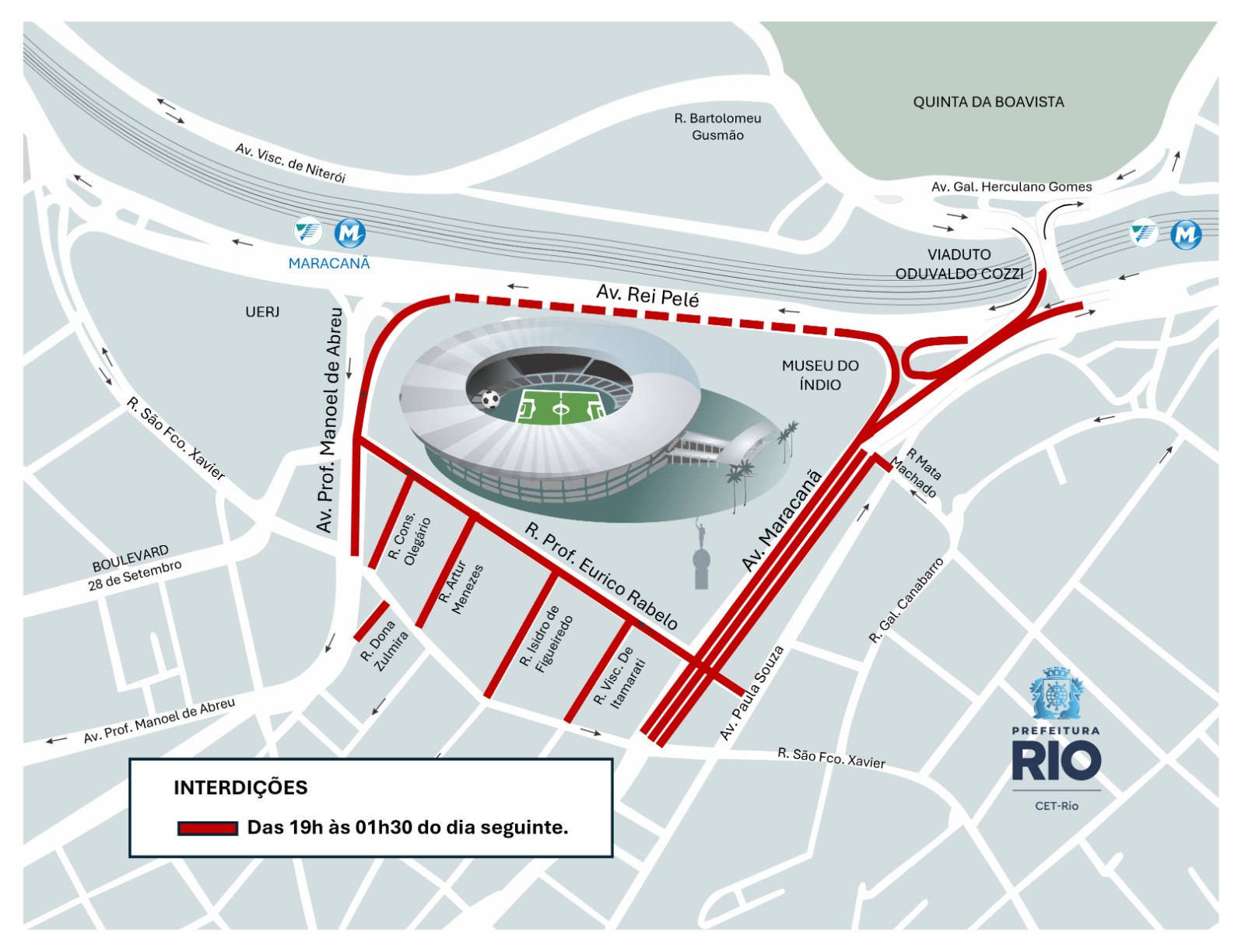 – Avenida Maracanã, ambos os sentidos, entre a rua São Francisco Xavier e a avenida Rei Pelé;
