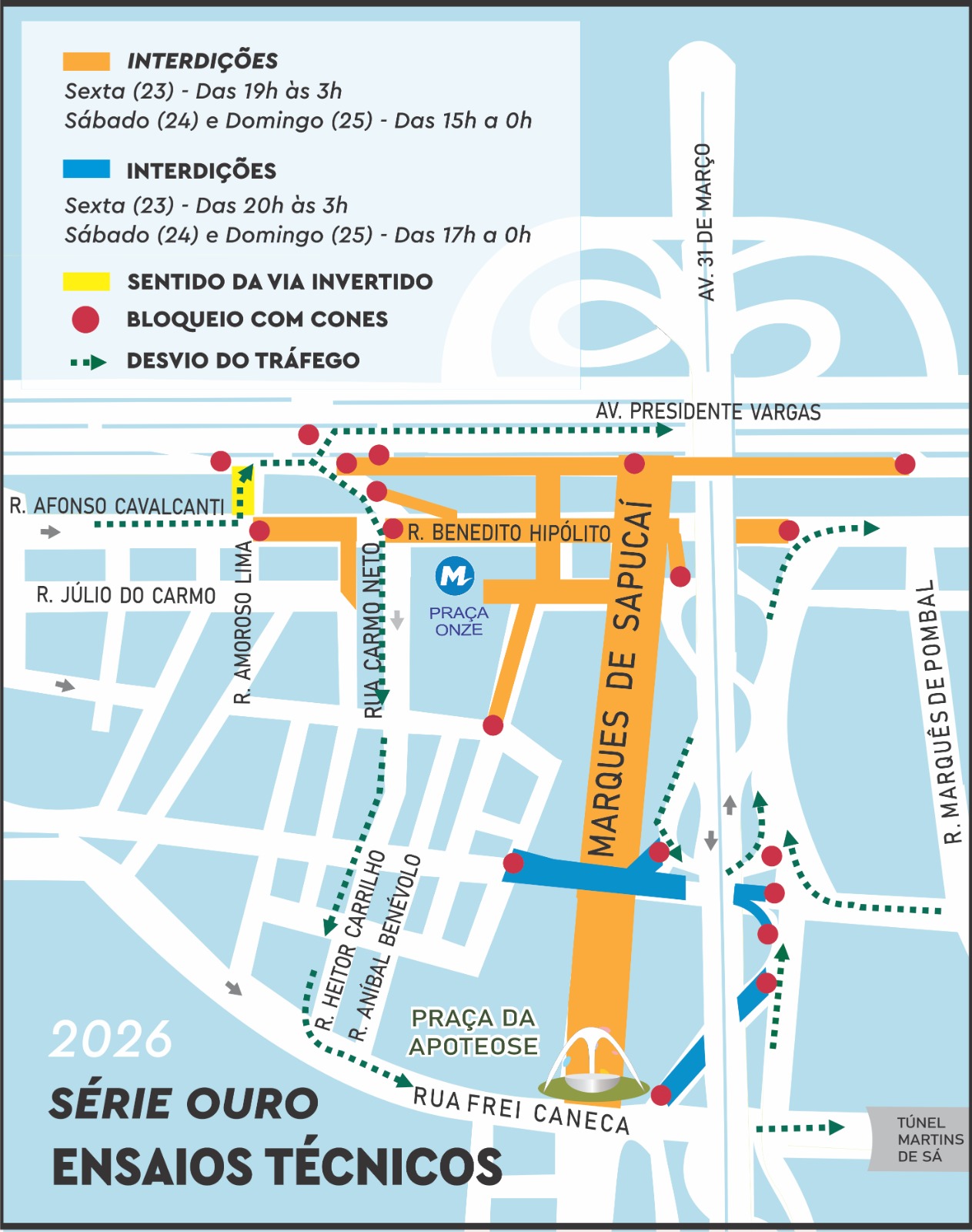 As interdições ao tráfego de veículos acontecem a partir das 19h de sexta-feira, com término previsto às 3h de sábado. Para os ensaios das noites de sábado e de domingo, as interdições serão das 15h a 0h. O planejamento prevê ainda proibição de estacionamento em diversas vias do entorno e nos acessos ao evento, além de inversão de mão de direção.