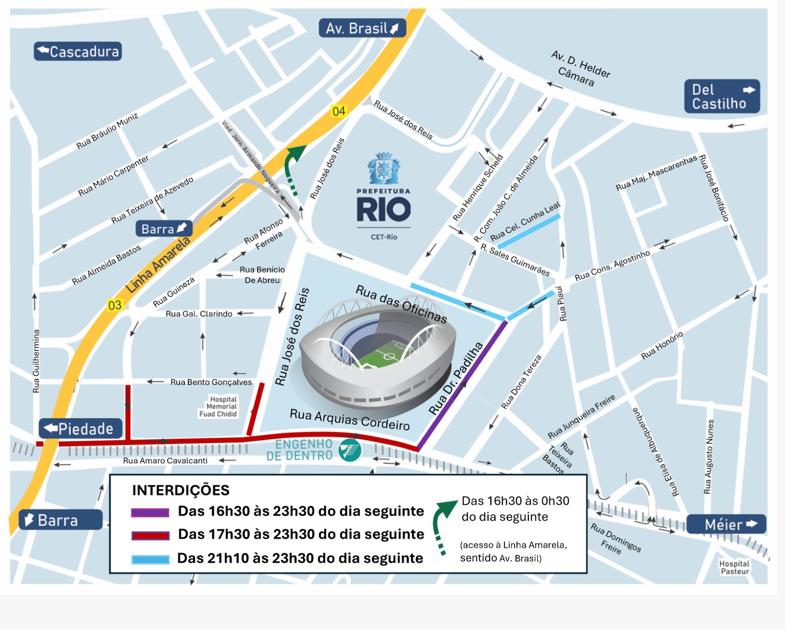 O acesso à Linha Amarela, sentido Avenida Brasil/Fundão, poderá ser realizado pela rua das Oficinas, a partir do cruzamento com a rua José dos Reis, sob o viaduto Jornalista Armando Nogueira.