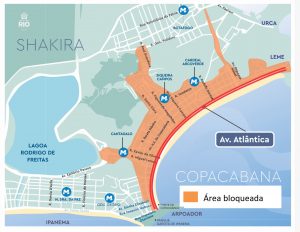 O trânsito em Copacabana começará a ser liberado a partir das 4h de domingo (03/05), mas permanecerá a interdição da Avenida Atlântica, pista da orla para a área de lazer como funciona aos domingos e feriados, além de outros 24 pontos de bloqueios externo. A partir das 10h será liberada a pista junto às edificações da Av. Atlântica. A reversível será montada na pista junto às edificações.