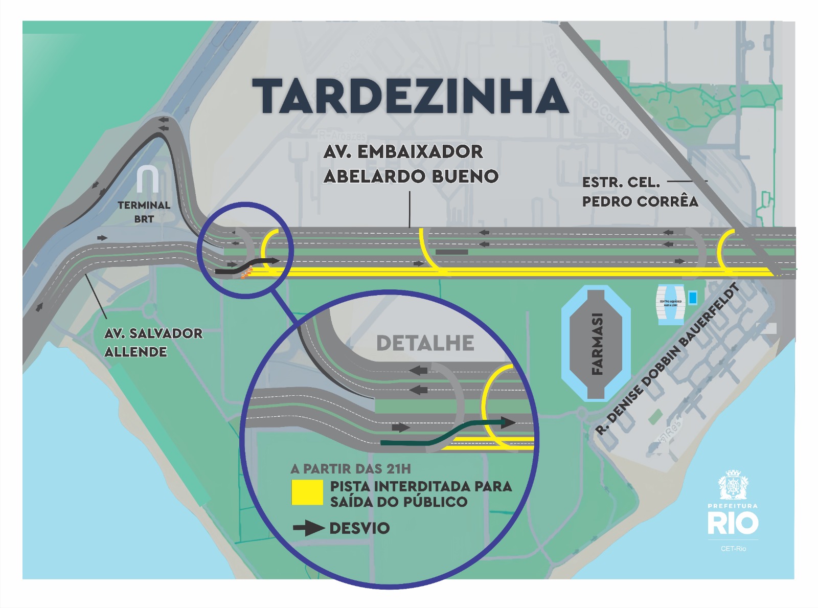 Para garantir a segurança viária durante a dispersão do público, a pista lateral da Avenida Abelardo Bueno, no sentido Avenida Ayrton Senna, será fechada a partir das 21h. Os motoristas devem redobrar a atenção à sinalização e seguir as orientações dos agentes de trânsito que atuarão na região. Não haverá estacionamento público no entorno do evento, sendo recomendada a utilização do BRT para a ida e a volta.