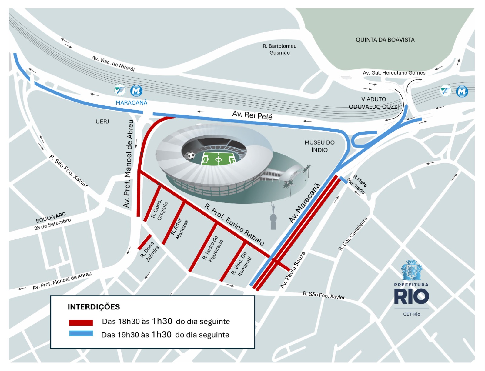 A Companhia de Engenharia de Tráfego do Rio de Janeiro (CET-Rio) realizará nesta quarta-feira (19/11) uma operação de trânsito para o jogo entre Flamengo e Fluminense pelo Campeonato Brasileiro, que acontecerá às 21h30, no estádio do Maracanã. As interdições ao trânsito de veículos na região começam a partir das 18h30 e vão até 1h30 de quinta-feira (20/11). Além dos locais regulamentados com proibição de estacionamento, outras vias também estarão restritas ao estacionamento a partir das 10h.