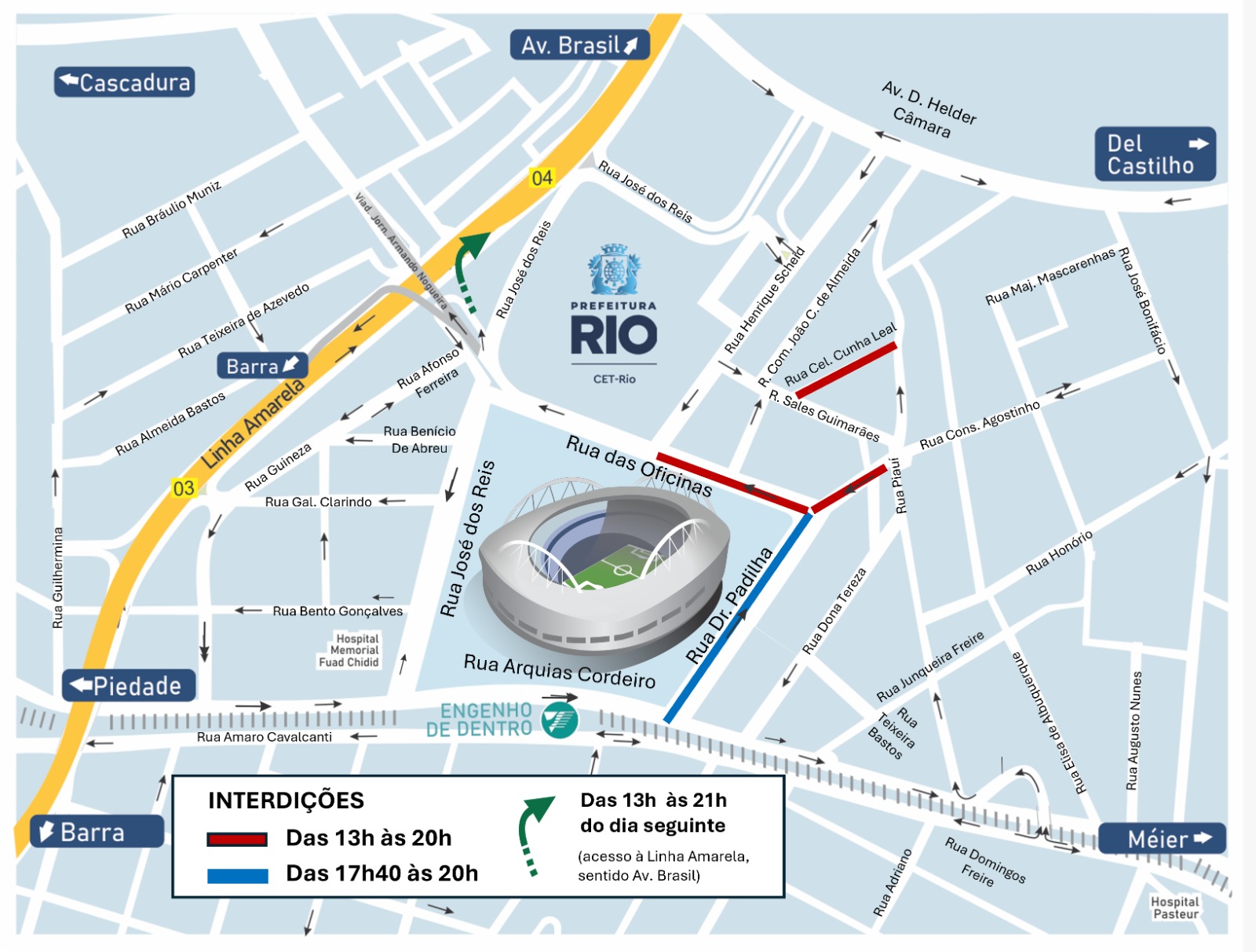 O acesso à Linha Amarela, sentido Avenida Brasil/Fundão, poderá ser realizado pela rua das Oficinas, a partir do cruzamento com a rua José dos Reis, sob o viaduto Jornalista Armando Nogueira.