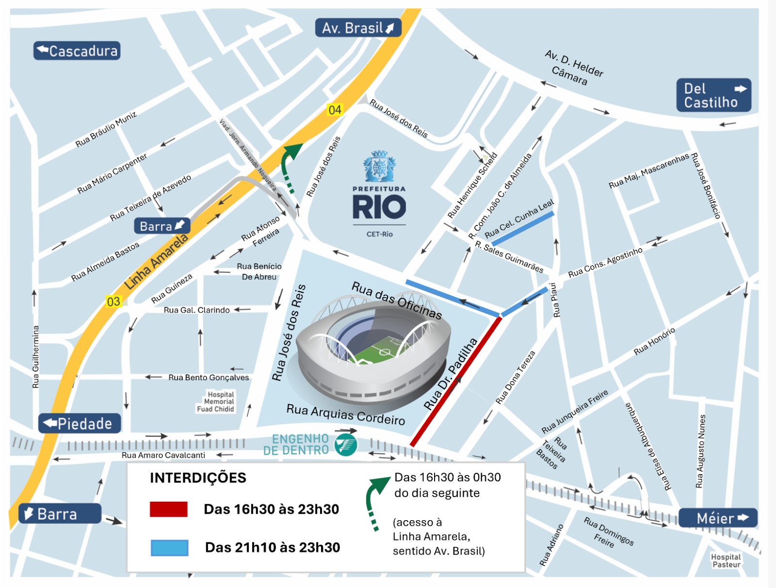 A Companhia de Engenharia de Tráfego do Rio de Janeiro (CET-Rio) realizará neste sábado (22/11) operação de trânsito para o jogo entre Botafogo e Grêmio pelo Campeonato Brasileiro, que acontecerá às 19h30, no estádio Nilton Santos, no Engenho de Dentro, Zona Norte da cidade. As interdições ao trânsito de veículos na região começam pela Rua Dr. Padilha a partir das 16h30. O acesso à Linha Amarela estará aberto das 16h30 a 0h30.