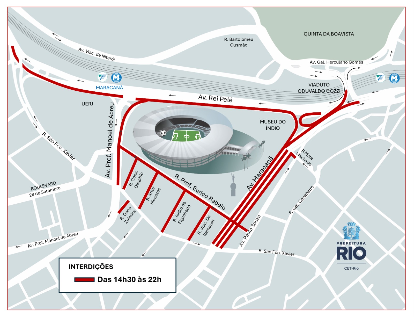 A Companhia de Engenharia de Tráfego do Rio de Janeiro (CET-Rio) implantará neste domingo (21/12) uma operação especial de trânsito para o jogo entre Vasco e Corinthians pela final da Copa do Brasil, que acontecerá às 18h, no estádio do Maracanã. As interdições ao trânsito de veículos na região começam a partir das 14h30 e vão até as 22h. Além dos locais regulamentados com proibição de estacionamento, outras vias também estarão restritas ao estacionamento a partir das 10h.
