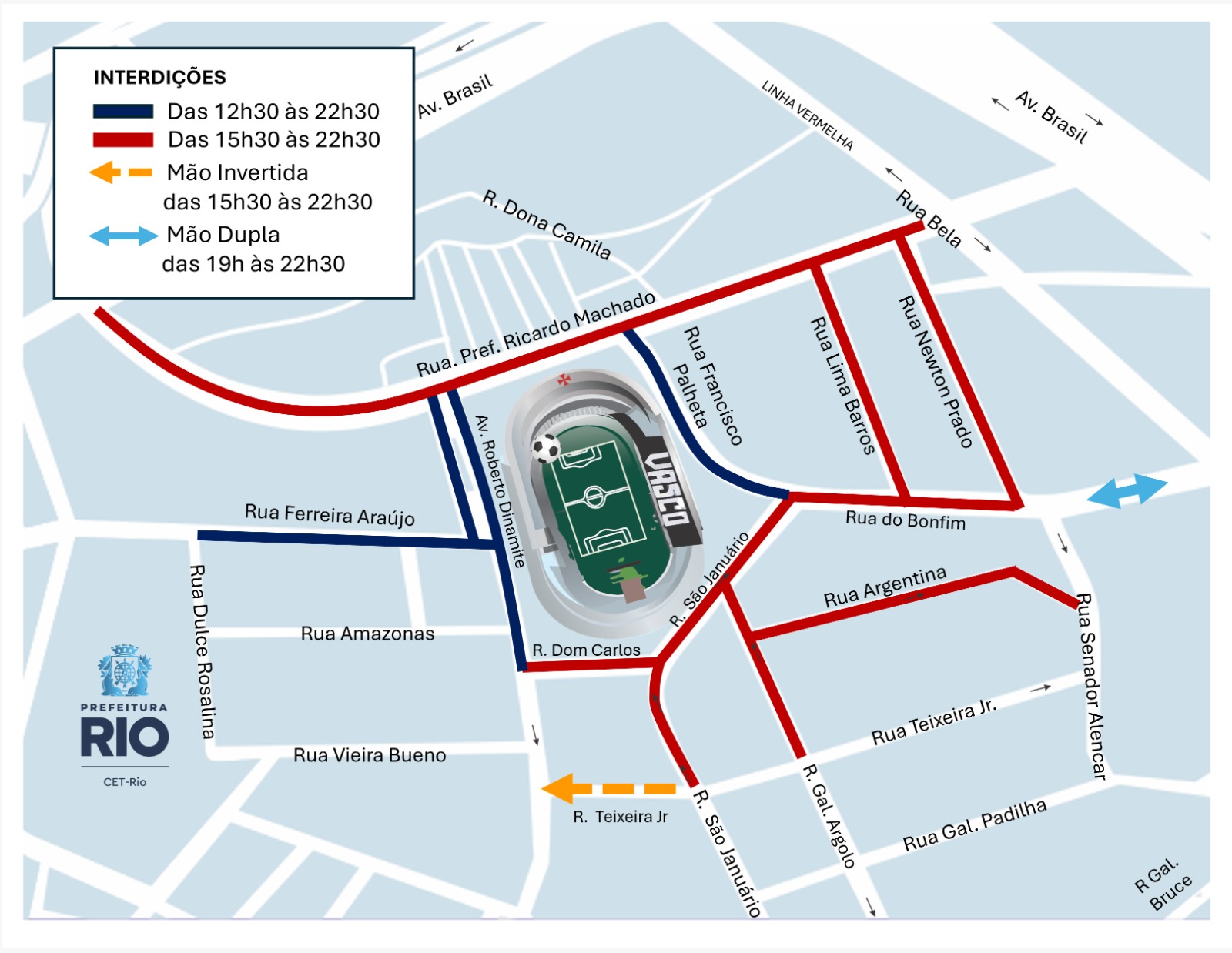 A partir das 15h30, outras vias do entorno do estádio serão interditadas seguindo o planejamento operacional. A rua Teixeira Júnior, entre a avenida Roberto Dinamite e a rua São Januário, terá a mão invertida e funcionará no sentido da rua São Januário à avenida Roberto Dinamite. A rua do Bonfim, entre a rua Senador Alencar e a Rua Bela, funcionará em mão dupla no período das 19h às 22h30. O estacionamento estará proibido a partir das 22h30 desta quinta-feira (27/11).