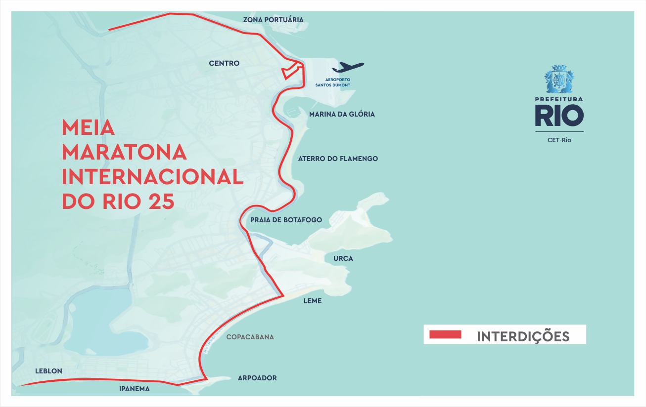 A CET-Rio informa que implantará um planejamento de tráfego para a realização da Meia Maratona Internacional do Rio neste domingo, dia 17 de agosto, em vias da Zona Sul e do Centro da cidade. Os atletas irão percorrer os bairros do Leblon, Ipanema, Copacabana, Enseada de Botafogo, Aterro do Flamengo e Centro. Serão mantidos os horários de término nos locais de área de lazer.