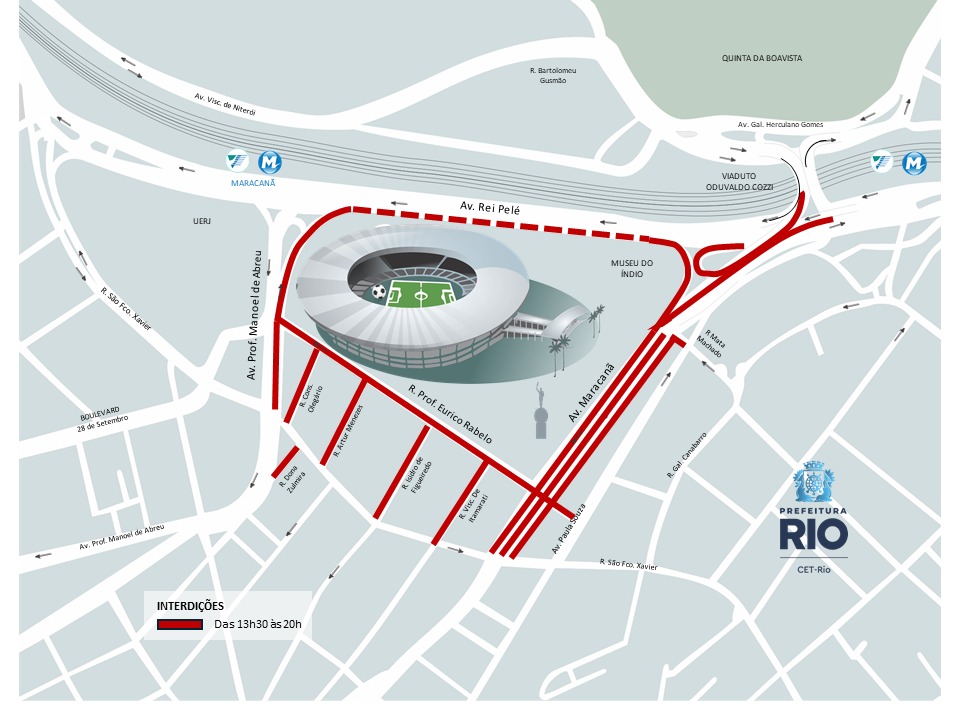 A CET-Rio realizará uma operação de trânsito neste domingo (19/10), para o jogo entre Flamengo e Palmeiras, pelo Campeonato Brasileiro, que acontecerá às 16h no estádio do Maracanã. A partir das 13h30, haverá interdições ao trânsito de veículos na região. Além dos locais regulamentados com proibição de estacionamento, outras vias estarão restritas a partir das 10h da data que ocorre a partida de futebol. Todas as intervenções serão encerradas às 20h do próprio domingo.