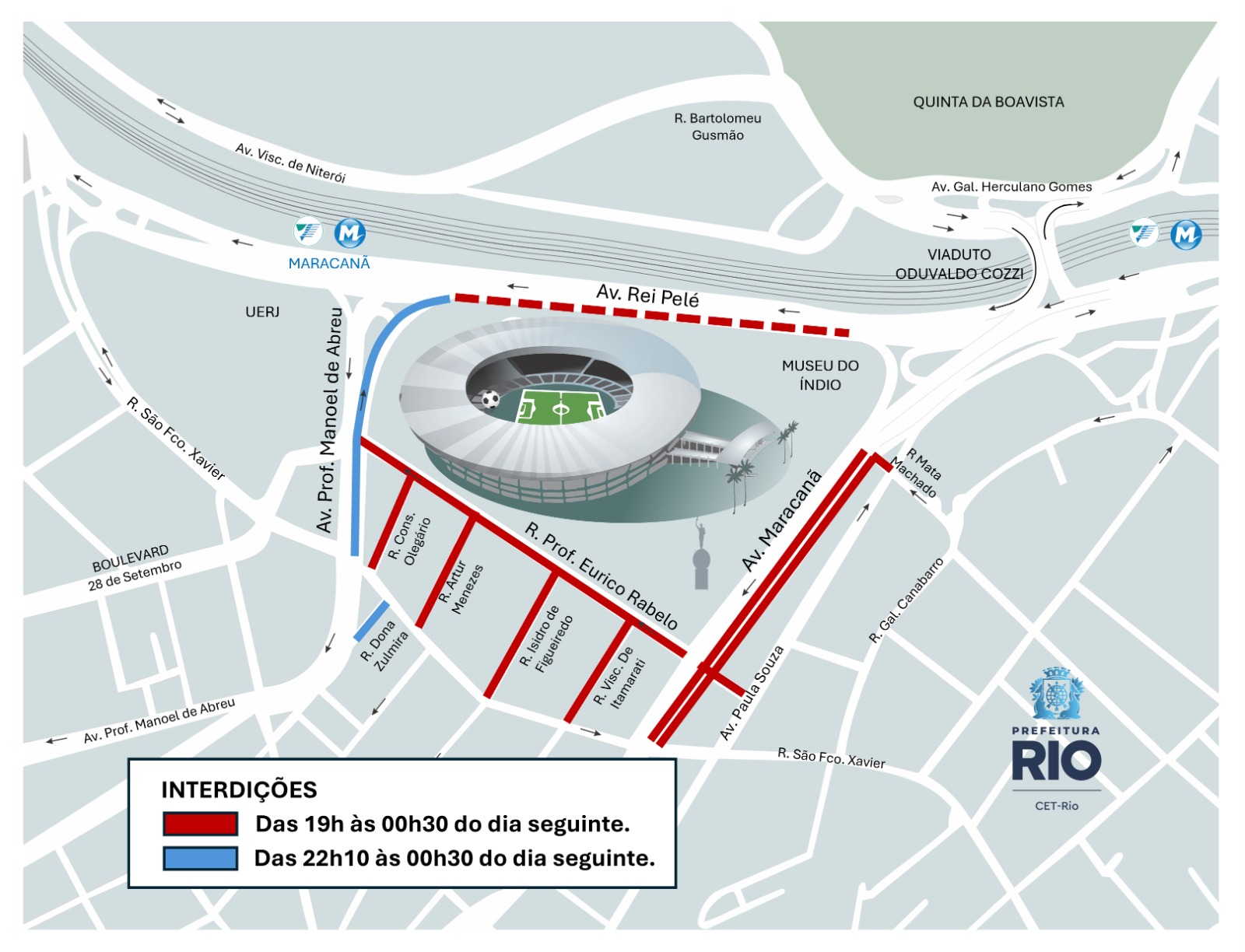 A Companhia de Engenharia de Tráfego do Rio de Janeiro (CET-Rio) realizará nesta quinta-feira (27/11) uma operação de trânsito para o jogo entre Fluminense e São Paulo pelo Campeonato Brasileiro, que acontecerá às 20h30, no estádio do Maracanã. As interdições ao trânsito de veículos na região começam a partir das 19h e vão até a 0h30 de sexta-feira (28/11). Além dos locais regulamentados com proibição de estacionamento, outras vias também estarão restritas ao estacionamento a partir das 10h.