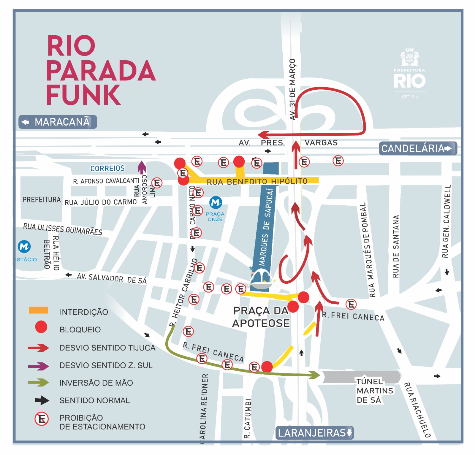 Esquema de trânsito para o evento Rio Parada Funk, no Sambódromo | Arte: CET-Rio